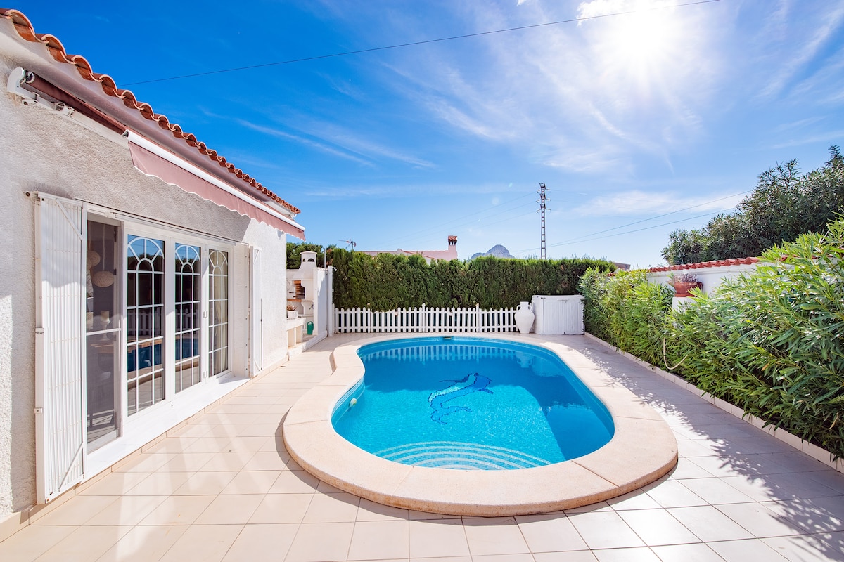 Вилла на верхнем этаже с потрясающим видом на море с крытой террасы с видом на природный парк Пеньон-де-Ифач и Средиземное море. На верхнем этаже находятся исключительно ваши 3 спальни (2 двуспальные, 1 односпальная), 2 ванные комнаты (душ + ванная комната), отдельная кухня и гостиная, диван-кровать размера King size в гостиной. Внизу только склад, так что у вас будет уединение и спокойствие. Снаружи находится частный сад площадью 1000 м² с бассейном, фруктовыми деревьями, пальмами и барбекю, идеально подходящий для отдыха или обеда на открытом воздухе с потрясающими видами.