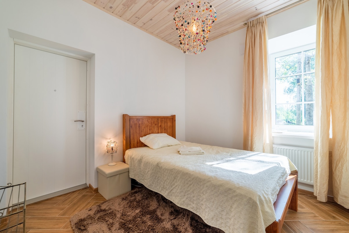 Sunset Village Ezera House — это уютный домик на берегу озера с потрясающим видом и спокойной атмосферой. В распоряжении гостей собственная терраса, электрическая сауна и полностью оборудованная кухня. В спальне наверху установлена двуспальная кровать размера King size, а диван раскладывается в дополнительную кровать. Гости могут насладиться костром на берегу озера, грилем на открытом воздухе, а также бесплатным использованием лодок и катамарана. Идеально подходит для расслабляющего отдыха в окружении природы.