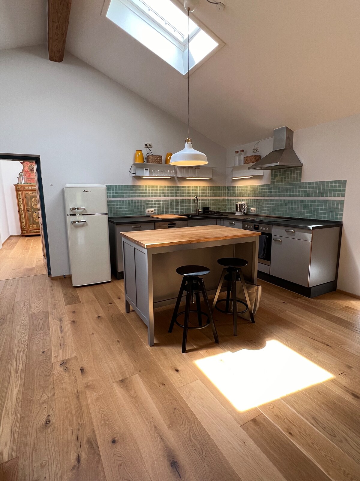 Bright and spacious apartment located in a peaceful village in the Bavarian Alps. It's an ideal place for couples or families wanting to relax or work remotely. From the balcony, you can enjoy beautiful views of the Kampenwand. The nearby Chiemsee offers great opportunities for swimming, cycling, and hiking. In winter, ski resorts can be reached within a short drive. The apartment is conveniently located between Munich and Salzburg, making it a perfect stop on the way to southern Europe.