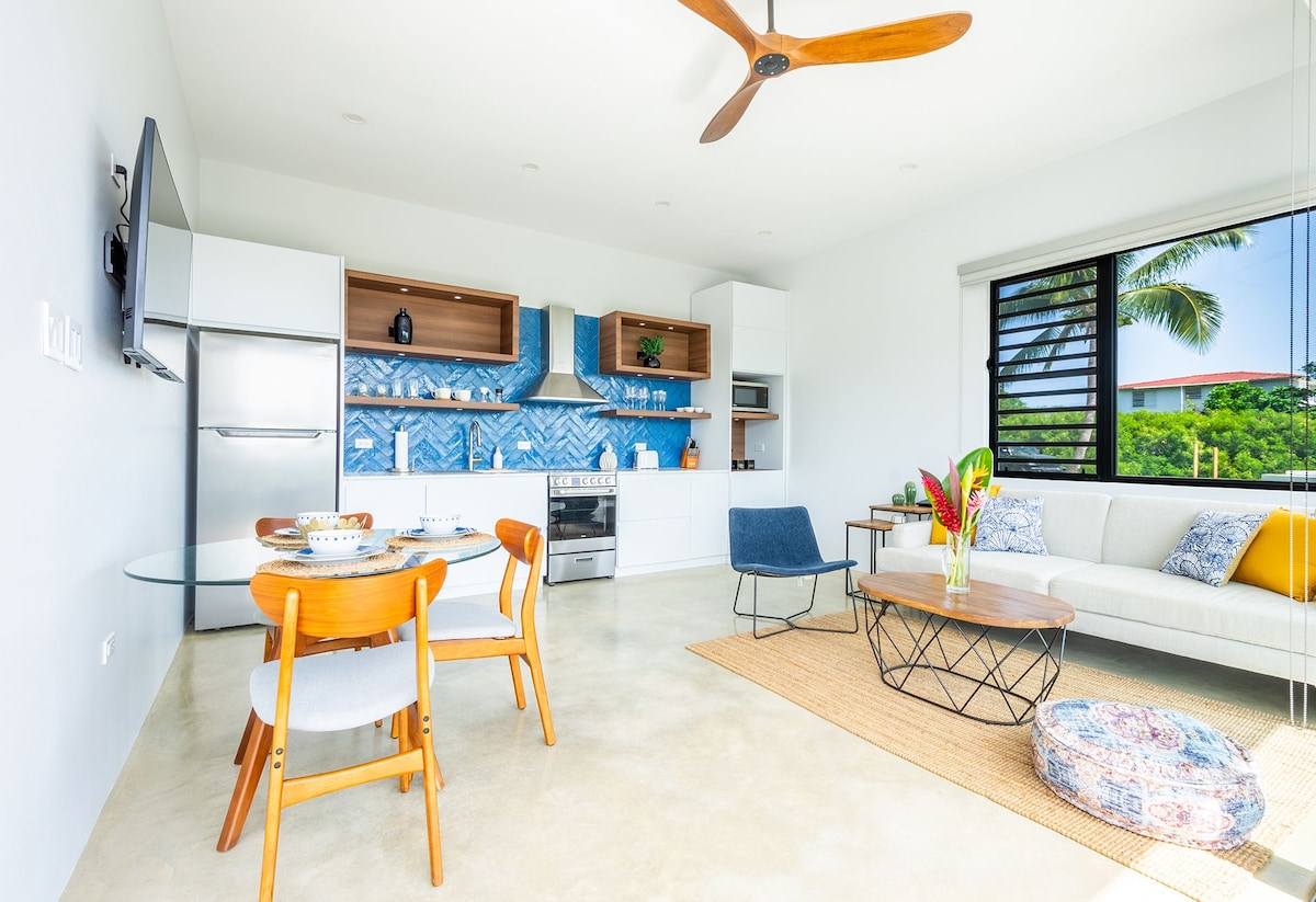 **Casita Azure** — это современная недавно построенная вилла с одной спальней в районе Пунтас в Ринконе, в нескольких минутах от всемирно известных пляжей, баров и ресторанов. Насладитесь потрясающим видом на океан и джунгли, частным бассейном с подогревом, патио, душем на открытом воздухе, барбекю-грилем и обедом на открытом воздухе. Этот роскошный домик с генератором для душевного спокойствия — это безмятежный отдых, погруженный в природу, и его трудно покинуть.