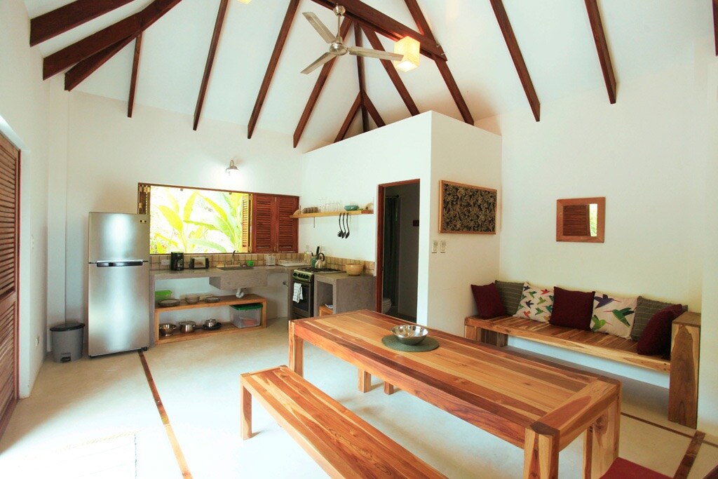 Этот дом в джунглях предназначен для спокойного и комфортного отдыха в окружении природы. Построенный на возвышении, он отличается чистой и современной архитектурой с натуральными материалами, открытыми пространствами и сильной связью между внутренним и внешним пространством. Светлая гостиная включает в себя офисное помещение с большими окнами и студию пилатеса, которая выходит в гостиную и обеденную зону. Идеально подходит для гостей, которые ценят природу, уединение, спокойные пространства и продуманный дизайн. Очень близко от пляжа и города, но тихо и спокойно.