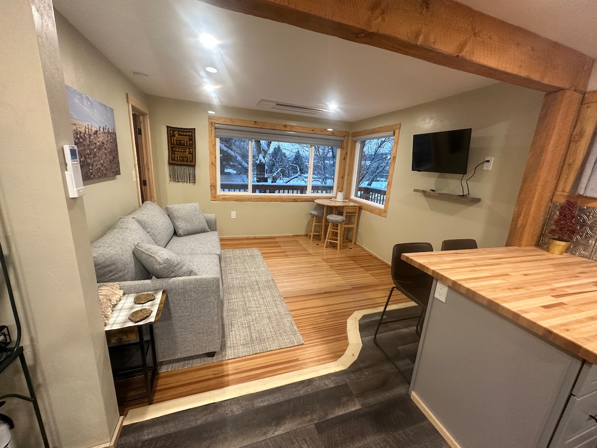 Мы предлагаем все необходимое для вашего отдыха. В этом гостевом люксе с 2 спальнями, 1 ванной площадью 1500 кв. футов, есть дополнительная спальная зона с футоном размера Queen size и полноценной кухней, а также стиральная машина и сушилка, а также частный вход в патио на уровне сада с грилем, столом/стульями и зоной для разговора. Жилье расположено в центре Микера, в 4 кварталах от центра города, а из окон открывается прекрасный вид на долину реки Уайт-Ривер и окружающие горы.