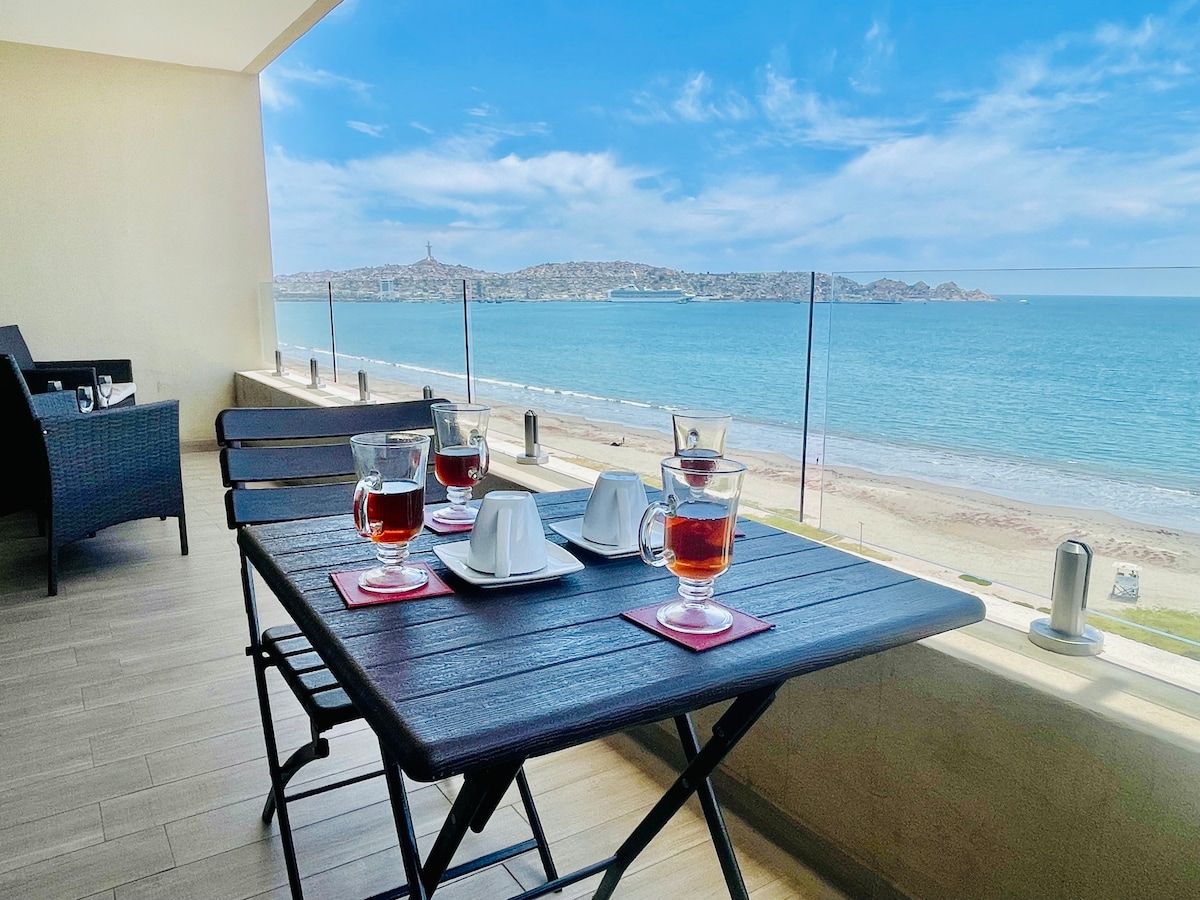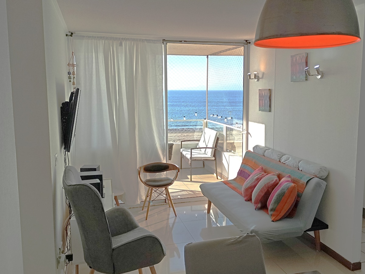 Departamento con vista directa al mar, primera línea de playa, cuenta con 2 dormitorios y 2 baños, estacionamiento privado cubierto, internet de alta velocidad, televisión smart tv en todos sus espacios, cuenta con amenity como ropa de cama, sabanas, toallas. cuenta con cocina completamente equipada, encimera, horno eléctrico, microondas. Se encuentra emplazado en un tranquilo lugar de la avenida, ideal para descansar y desconectarse, buscamos siempre que te sientas como en casa, te esperamos!