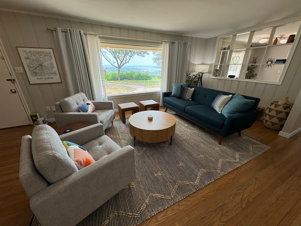 Welcome to this calm, stylish 1950s mid century home nestled on the edge of the great city of Fort Worth! With a large view stretching out across the valley containing Lake Worth and the NAS Joint Reserve Base. One of the most complete sunset views available in Fort Worth. Special trips for the air shows and 4th of July fireworks over the lake. Access to most of Fort Worth within 20 minutes and loop 820 provides full access to all of the DFW area. 30 minute direct drive to/from DFW airport.