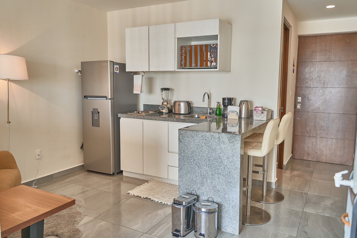 Потрясающая квартира-лофт с прямым доступом к бассейнам, недалеко от центра Тулума и всего в нескольких минутах от впечатляющего пляжа и пляжных клубов Тулума. Наслаждайтесь несколькими потрясающими бассейнами, бассейном на крыше, шезлонгами, хорошим тренажерным залом, круглосуточным персоналом, сильным кондиционером, лифтом, быстрым Wi-Fi (400 Мбит/с), затемняющими шторами, 55-дюймовым телевизором Smart TV, полностью оборудованной кухней и частной парковкой. Попробуйте ужин на открытом воздухе или просто напитки с прекрасным панорамным видом в ресторане на крыше.