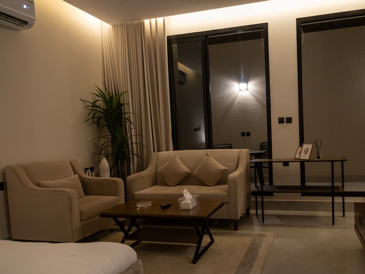 Квартира расположена в лучших районах Эр-Рияда, в 7 минутах от бульвара, в 6 минутах от Финансового центра короля Абдуллы, в 3 минутах от улицы короля Фахда и в непосредственной близости от всех известных мероприятий и ресторанов. В квартире есть гостиная с крышей Sky Lite (солнечный свет проникает через потолок), спальня, ванная комната, зона для отдыха на улице, чайная, кофейня, мини-кухня, обеденный стол на двоих и водный канал.