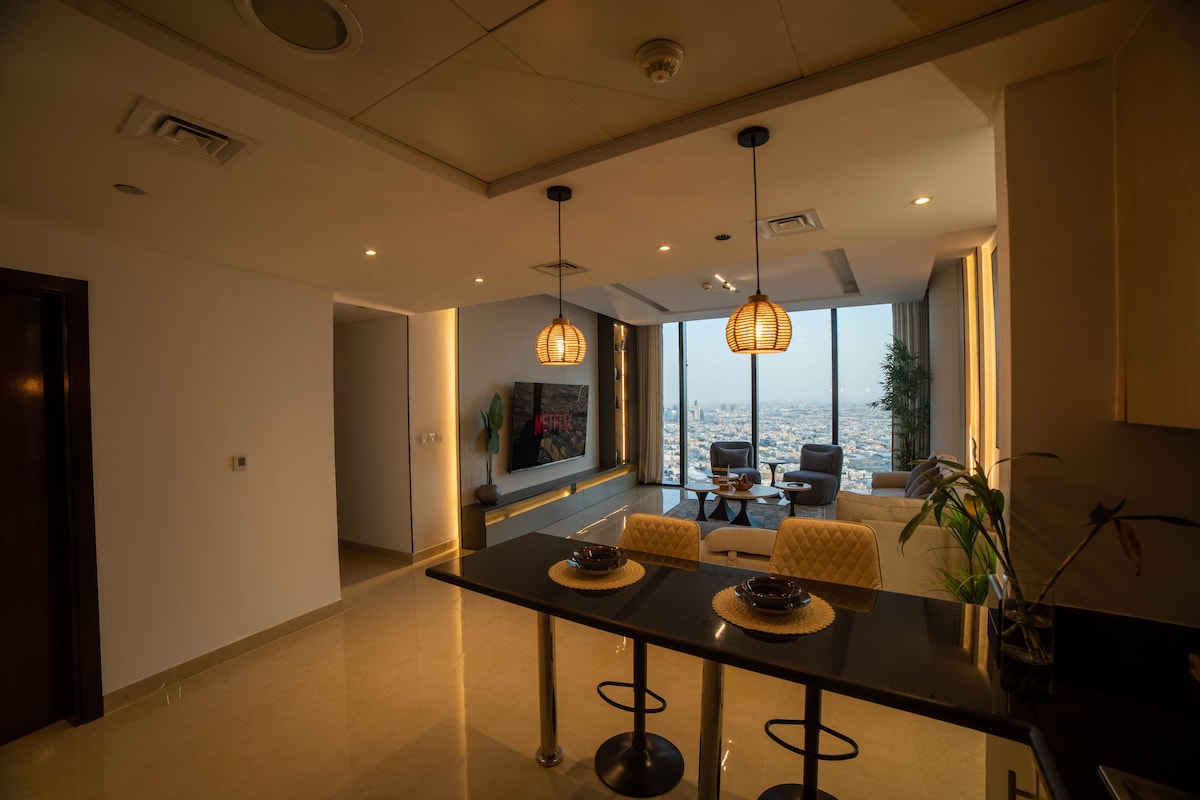 Добро пожаловать в ваш роскошный уголок в центре Эр-Рияда! Эти стильные апартаменты расположены прямо на улице King Fahad Road, откуда открывается уникальный вид на башню Kingdom Tower как с вашего балкона, так и из гостиной. 🛌 Элегантная спальня 🎬 Собственный кинозал с большими диванами (внутри квартиры). 🏊‍♂️ Общий панорамный бассейн на крыше 🏋️ Полностью оборудованный тренажерный зал (для мужчин и женщин). 🍳 Открытая кухня 🚿 2.5. Ванные комнаты 🌆 Балкон с видом на Kingdom Tower Идеально подходит для пар, деловых путешественников или семей.