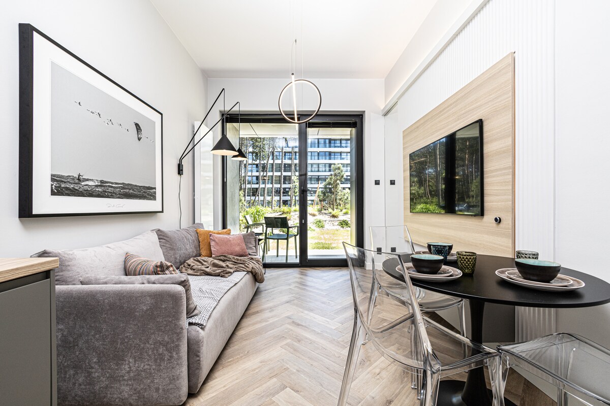 Квартира с садом, между морем и озером, в самом центре заповедника и соснового леса, в 3 минутах ходьбы до пляжа. Есть частная, крытая и просторная терраса, гостиная с полностью оборудованной мини-кухней, спальня, ванная комната, подземный гараж и велосипедная комната. Большие окна позволяют природе входить в интерьер квартиры, поэтому вы всегда на связи с природой. На территории поместья есть сауна, бассейны, джакузи, тренажерный зал и спа-зона (за отдельную плату).