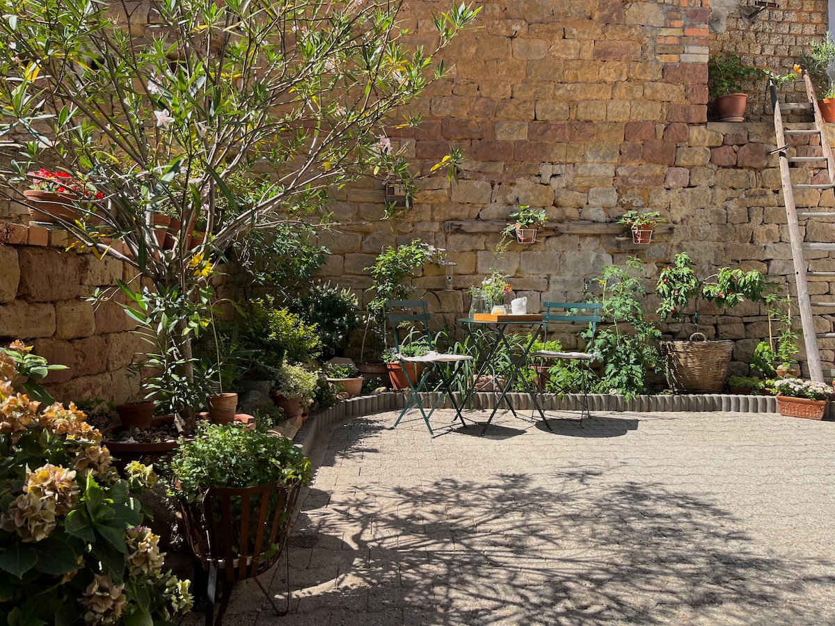 Уютная, тихая квартира на втором этаже, с балконом, а также двором и доступом к нашему саду в средиземноморском стиле. Квартира расположена недалеко от центра Вахенхайма, с небольшими ресторанами и винодельнями, в окружении садов по дороге к руинам Вахтенбурга, откуда открывается великолепный вид. Жилье подходит для длительного проживания и для пар, которые любят тишину и природу. По запросу: трансфер от железнодорожного вокзала. Доступны велосипедные и пешеходные маршруты.