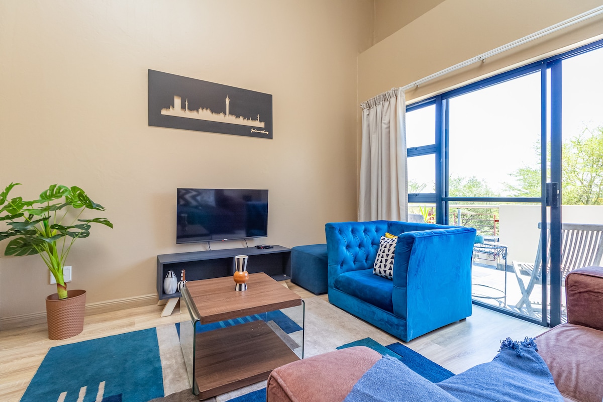 We welcome you to relax in our calm and luxurious space situated in a quiet section of Fourways. The apartment is uniquely and tastefully designed with amenities that radiate style and comfort. Treat yourself to this stunning apartment with a queen size bed, a fully equipped kitchen and a modern bathroom. Unwind on the patio or on the couch and enjoy a TV with Netflix and Youtube. The apartment has electricity backup that runs the TV and the Wi-Fi. Book your stay today and indulge in luxury.