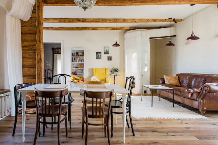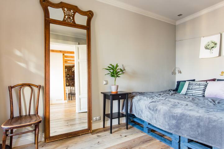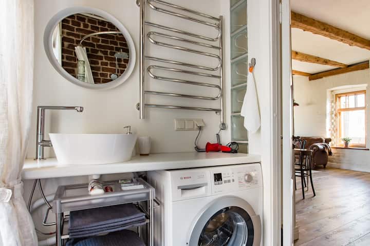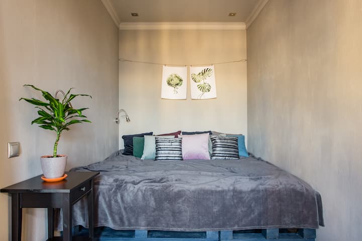 Мансарда 60 кв. м. Небольшая спальня + большая кухня гостиная. Идеально для 2 человек. Можно разместить дополнительно еще 2 человека за дополнительную плату в гостиной на удобных анатомических матрасах. Пожалуйста, указывайте точное число гостей. В квартире есть все удобства и необходимые мелочи. Качественный ремонт, дизайнерский интерьер. Wi-Fi с хорошей скоростью. В квартире светло, окна в тихий двор, красивый вид на крыши и закат. Достопримечательности в пешей доступности. Обратите внимание: мансарда находится на 6 этаже без лифта.