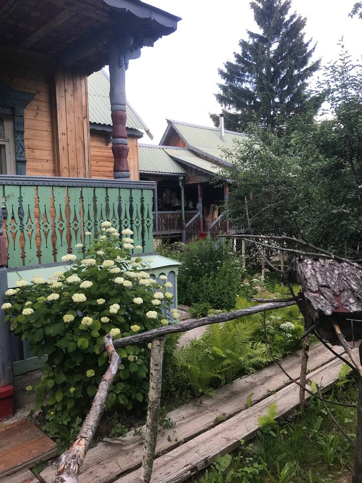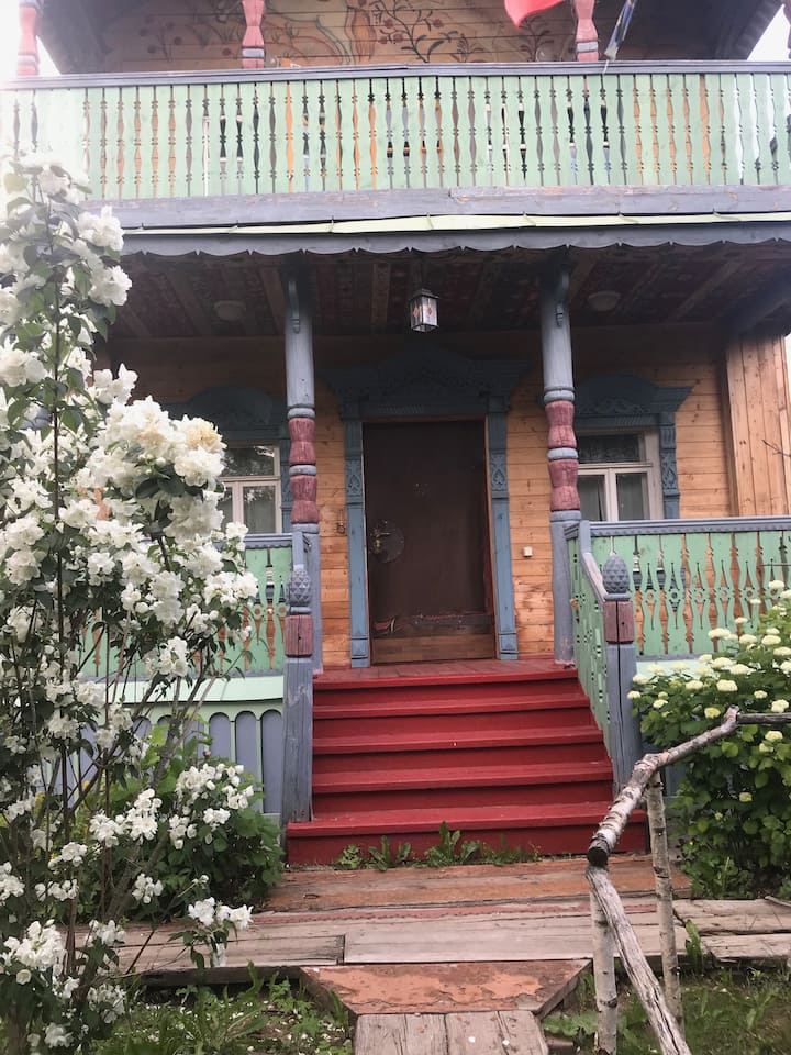 Приглашаем вас в красивый расписной старинный деревянный дом в окружение интерьера конца XIX-го — начала XX-го столетий. Главный дом - это просторный деревянный двухэтажный старинный дом, в котором на первом этаже расположены открытая и закрытая террасы, просторная кухня-столовая, большая гостиная с русской печью, одна душевая и одна туалетная комнаты, на втором этаже расположен главный зал и две отдельных комнаты для размещения гостей. Дом соединен крытой галереей с русской баней.