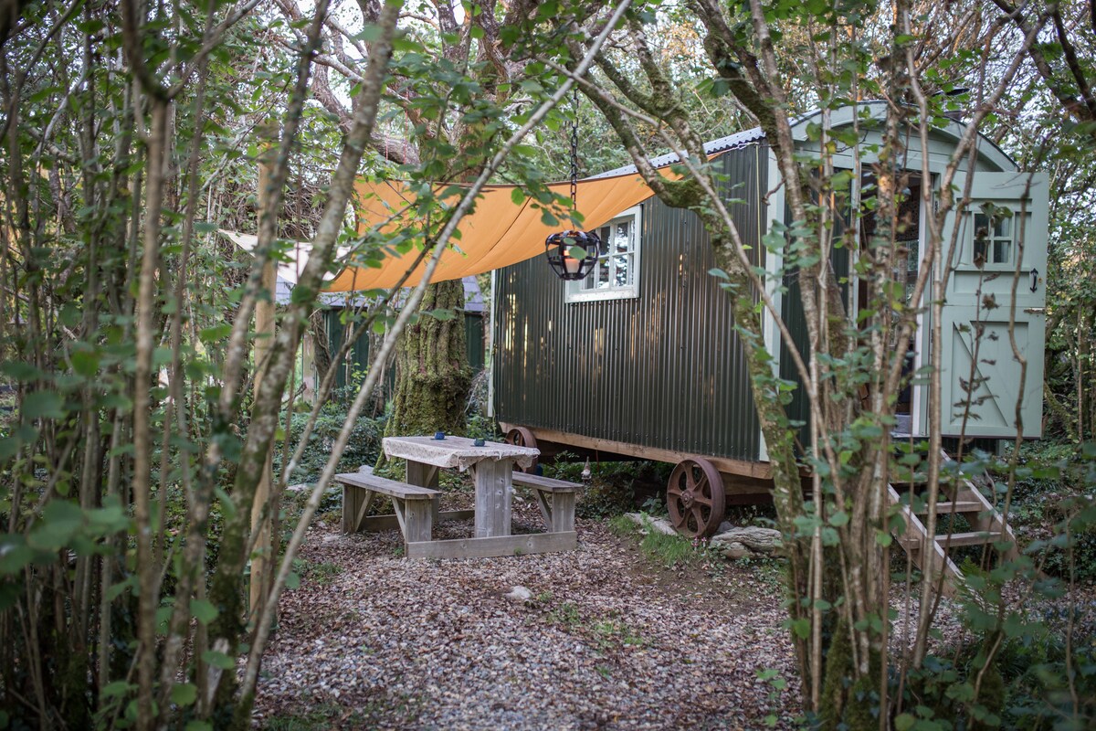 Beautiful shepherds hut powered by solar for an off grid experience along the Wild Atlantic Way situated on Connemara farm land located 20 minutes from Galway city and 10 minutes from Oughterard and Lough Corrib. Sleeps 3 with a double bed and a single bed. Kitchenette with running water and gas hob, separate fire pit/BBQ area and outhouse with toilet, sink and heated shower. There is a small wood burning stove in the Shepherds hut with kindling provided. Towels and bedding are also provided.