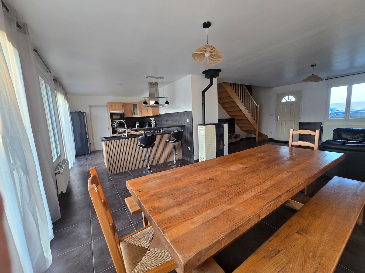 Insta : Normandy.guesthouse ⭐️ Meublé de tourisme classé 4* - Atout France 2025 🏡 Charmante maison en Normandie à 2h30 de Paris et 45 min des plages • Ancienne école en pierre rénovée • Logement ultra lumineux • Gand volume ouvert type loft • Hauteur sous plafond : 7,5 mètres • Rénové par une architecte