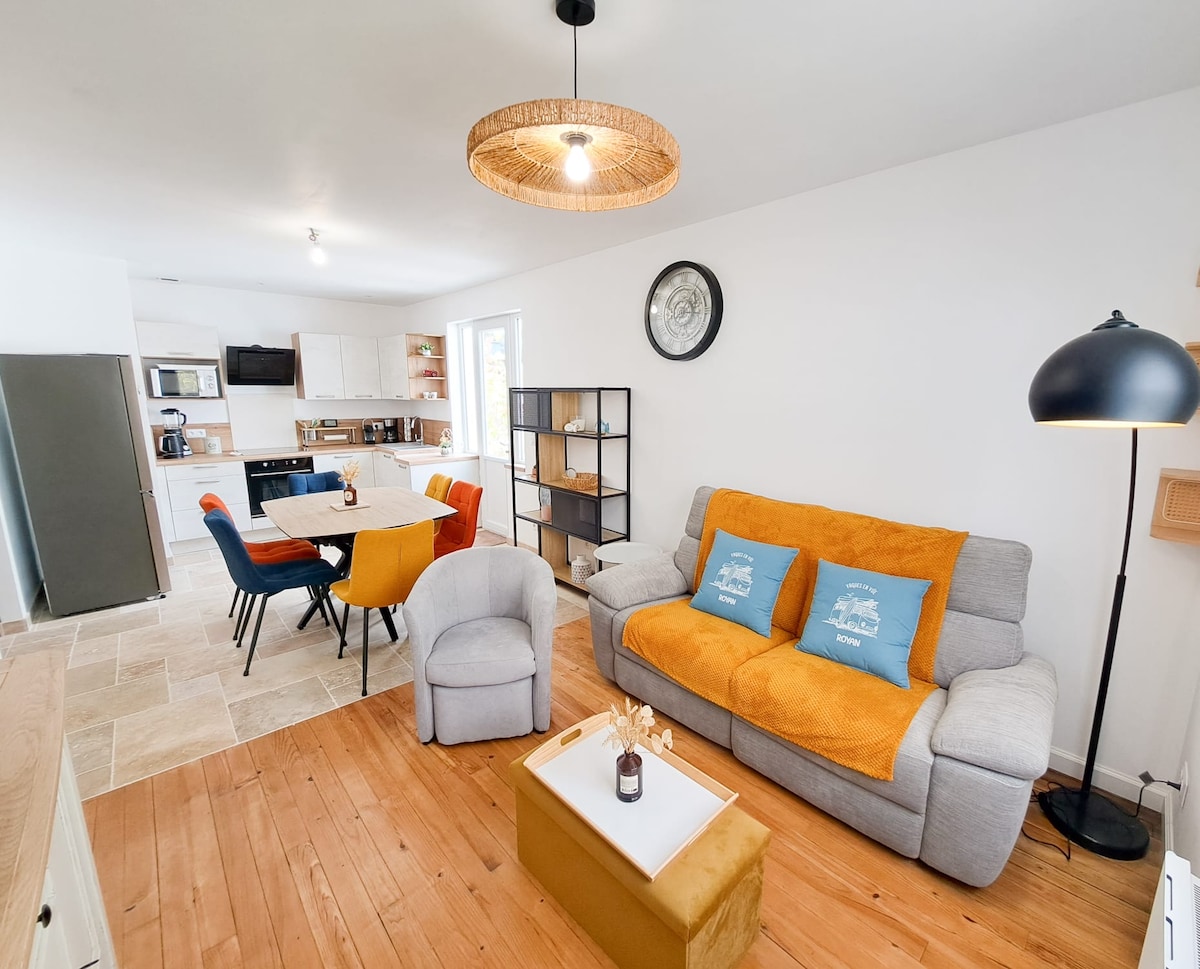 Жилье расположено в 1 км от пляжа Ройан и центра города. Приезжайте и наслаждайтесь тишиной этого маленького дома. Оценка 4 звезды от отдела качества услуг! В вашем распоряжении полностью оборудованная кухня, выходящая на террасу с шезлонгами и грилем. Две спальни с удобными кроватями позволят вам отдохнуть. Обе спальни оборудованы ванной комнатой (душ, раковина, туалет). Для второй — туалет (раковина, душ).
