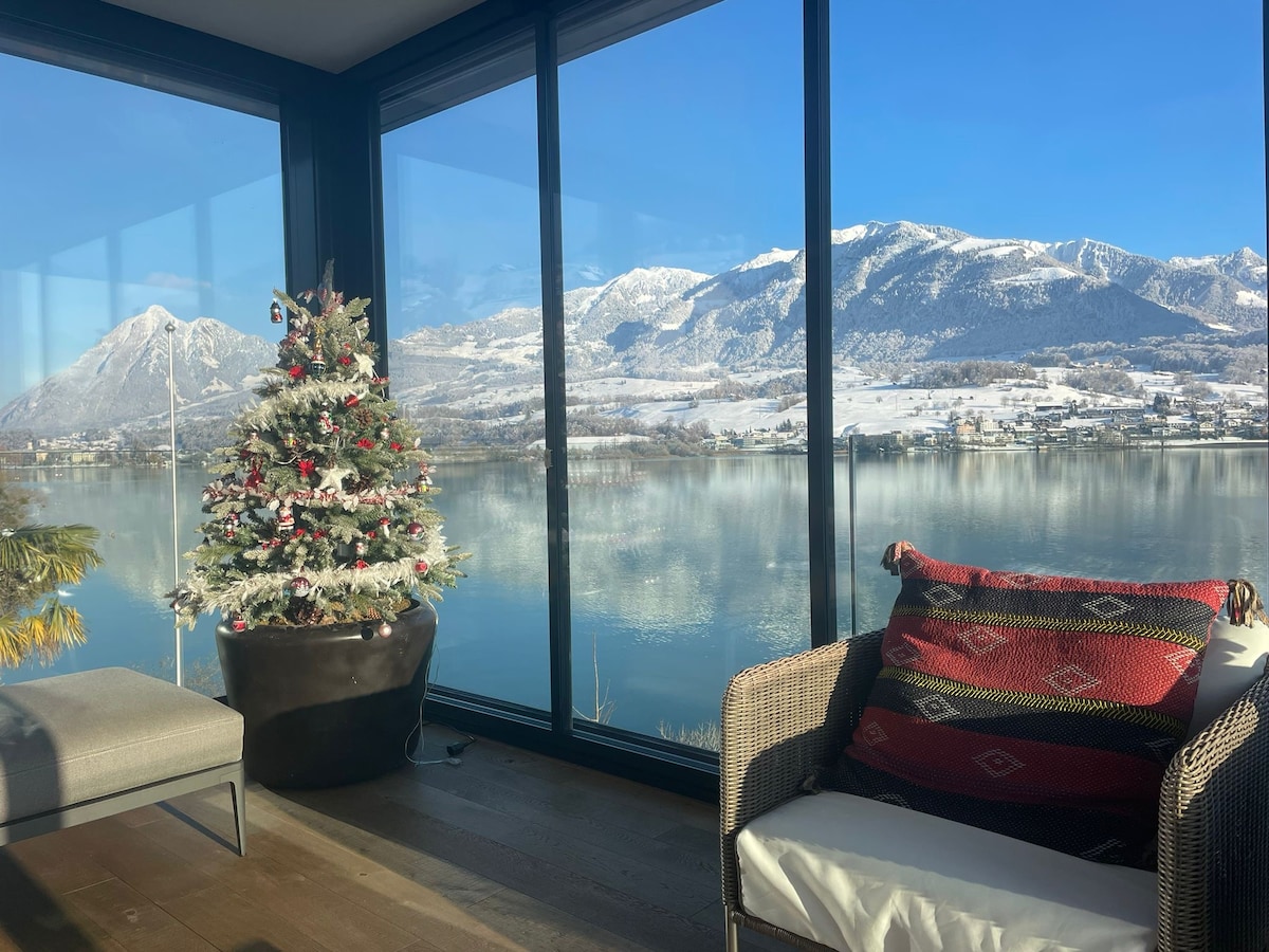 Private suite on the top of the owners’ inhabited villa with lake access and unique views of the Alps. Most highlights can be reached in less than 1 hr. Layout: spacious bedroom (with home cinema), attached panorama lounge, large kitchen, bathroom - all privately used. For occupancy of 3-5 people another private bedroom/bathroom (floor below, access by lift) is provided. Access to lake and garden. Free parking/wifi. Children are possible, small dogs only. The most popular Airbnb in Switzerland.