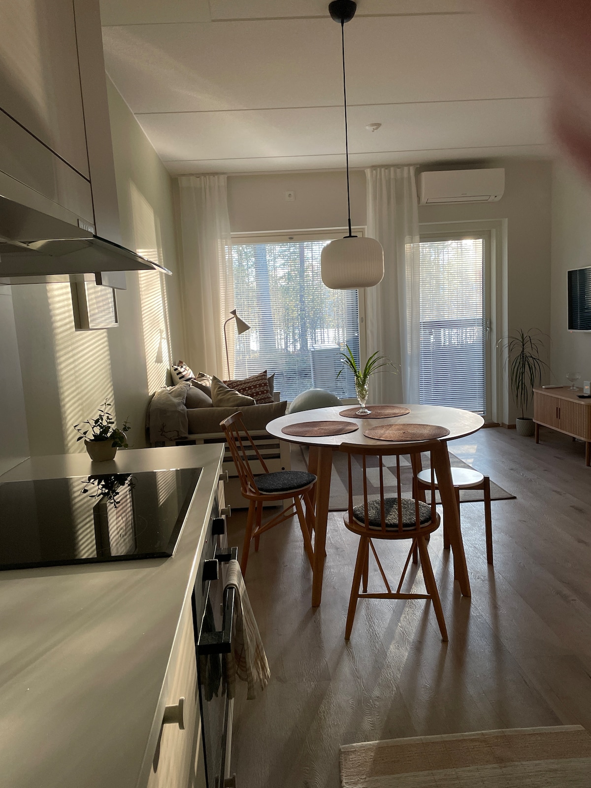 Уютная и чистая квартира площадью 26 квадратных метров в центре Каяани, в многоквартирном доме, построенном в 70-х годах, в нескольких минутах ходьбы от услуг. В доме есть лифт. В квартире есть небольшая кухонный уголок с холодильником, плитой, микроволновой печью и необходимой посудой. Посудомоечная и стиральная машины отсутствуют. В квартире имеется двуспальная кровать шириной 120 см. В ванной комнате есть душ и туалет. Балкон застеклен. Спокойный дом, где тишина в 22:00. Курение также запрещено на балконе.