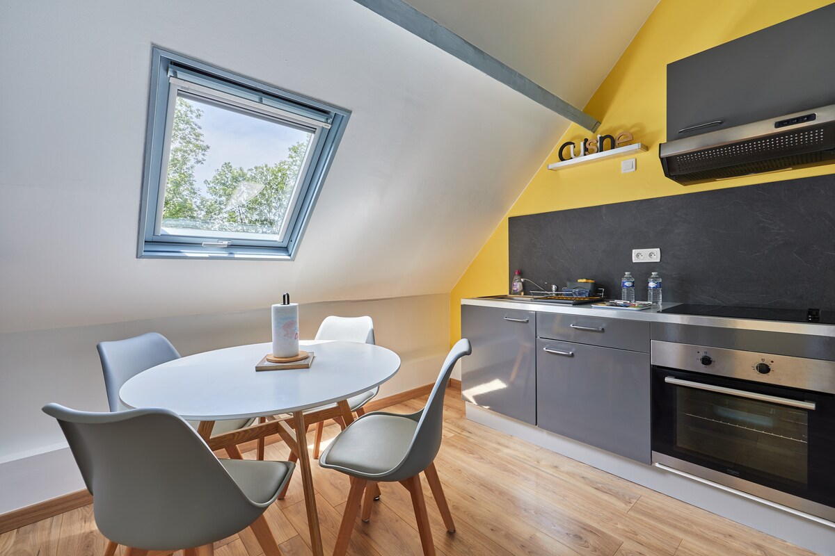 2 км до ОНФЛЁРА, Красивая и очень просторная, светлая квартира. две комнаты для двух человек Гостиная с гостиной, обеденной зоной и полностью оборудованной кухней. Атмосфера очень коконная и успокаивающая со всеми удобствами для гарантированного отдыха. Со стороны сада находится спальня с двуспальной кроватью размера Queen size. У подножья деревенских магазинов, бесплатная парковка через дорогу Идеальное расположение, потому что в центре нашего прекрасного региона: Etretat, Deauville, Cabourg.