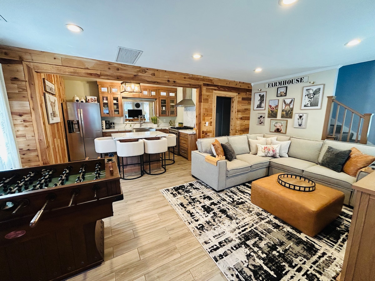 Вы можете отдохнуть в переоборудованном домике, внутри которого все совершенно новое и комфортное! Домик расположен между деревьями в районе с рекой Раннинг-Крик, вы можете дойти пешком до озера Грегори или доехать до озера Эрроухед. В доме есть полностью оборудованная кухня, обеденный стол, гостиная с телевизором Roku, один этаж, 1 большая спальня с кроватью размера King size, кожаный диван-кровать и ванная комната с мраморной душевой стеной. Вы можете отдохнуть на передней террасе с шезлонгами, чтобы понаблюдать за голубыми сойками и белками. Гриль для барбекю и парковка на 2 машины.