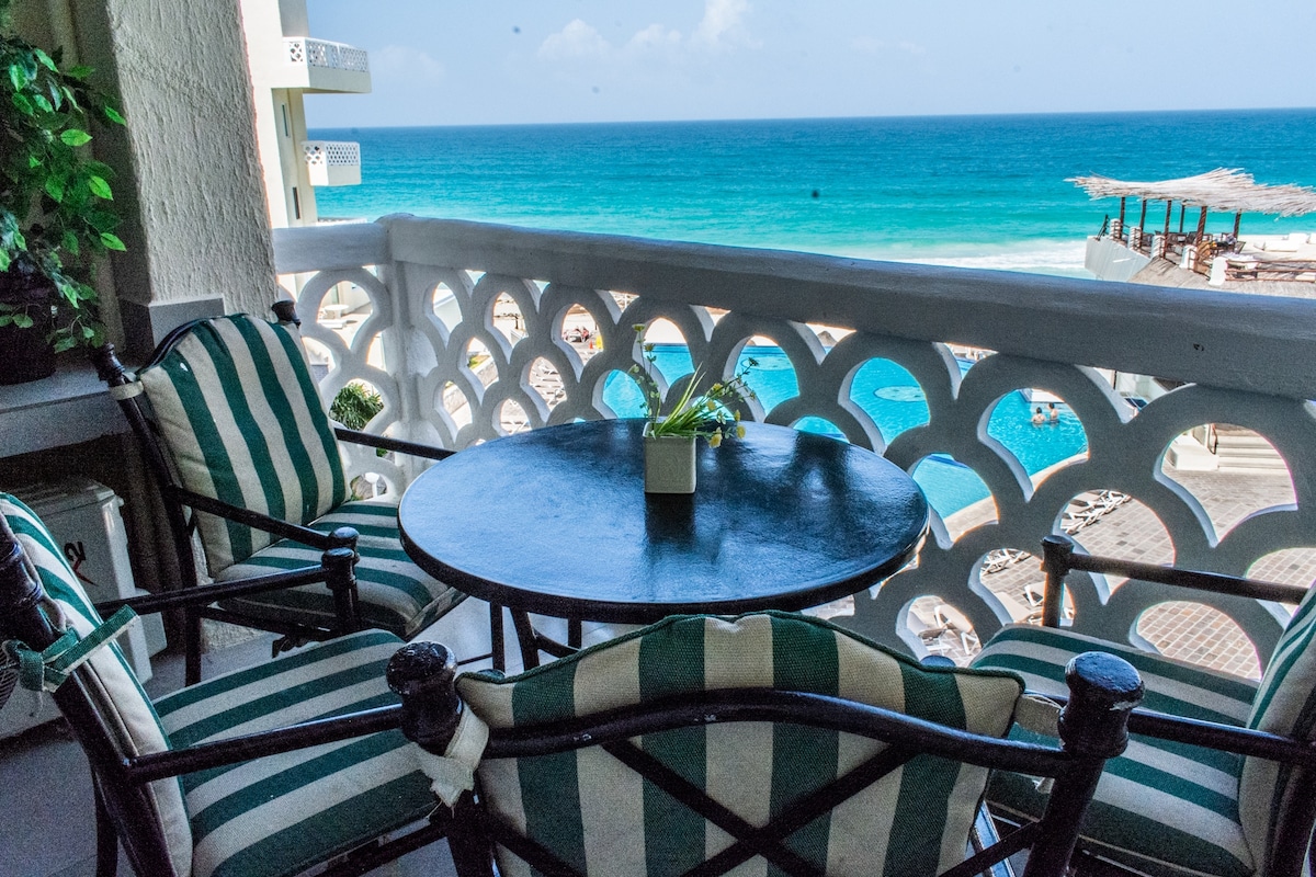 Прямо на пляже. Из окон открывается потрясающий вид на входную дверь. Из гостиной и спальни открывается вид на море. Для вас доступны такие услуги, как бассейны, джакузи, шезлонги, тени, тренажерный зал, теннисный корт (бесплатно) - высокоскоростной Wi-Fi; Все включено по желанию через отель для еды и напитков, так как мы делим удобства с курортом Oleo Cancun (сегодня 95 долларов США в день). Через дорогу также есть 3 ресторана (a la carte) + магазин.