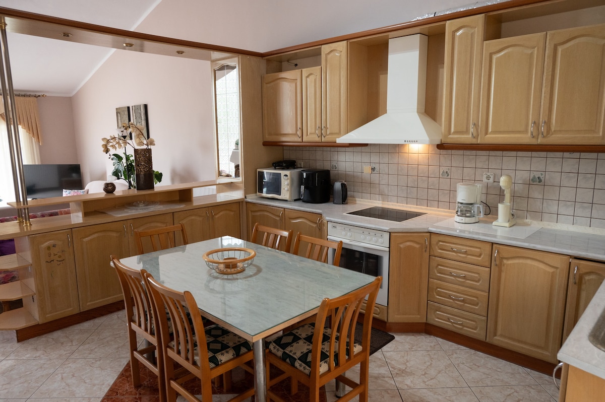 Очень просторный дом(87 кв. м) в нескольких минутах ходьбы от пляжа, полностью оборудованный прекрасным видом и большим, прекрасным садом. Также расположен в тихом районе недалеко от небольшого леса, отлично подходит для дневных прогулок. Расстояние до города Кавала составляет 8 км, неподалеку есть мини-маркет и таверны.