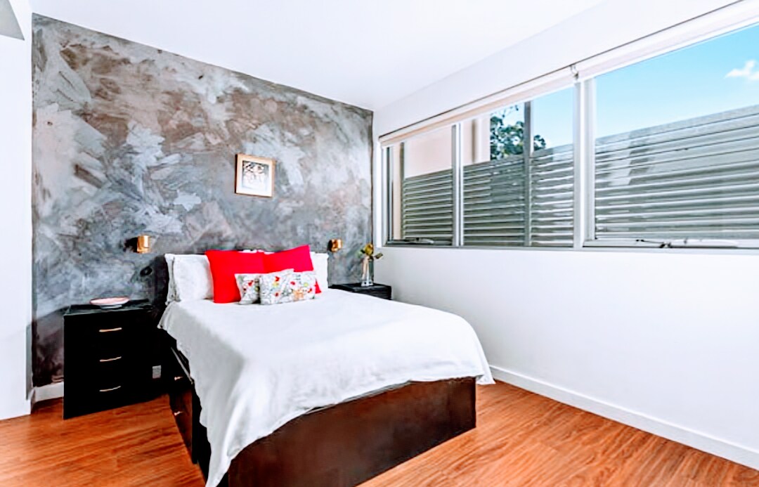Добро пожаловать в ваш дом вдали от дома в самом центре Ньютауна. Мои 2 квартиры в этом комплексе являются квартирами премиум-класса (раздвижная дверь балкона обеспечивает свет/свежий воздух)! Продуманная до мелочей квартира для взыскательных гостей, которым нужна тишина, уединение, минималистичный, суперкомфортный стиль, Wi-Fi, кондиционер, потолочный вентилятор, деревянные полы, кухня, двуспальная кровать размера Queen size, стиральная машина, потрясающий сад на крыше, виды. На ресторанной/кафе-улице, 2 остановки на поезде до города. 2 минуты ходьбы до поезда, безопасный, надежный небольшой квартал из 20 домов вокруг сада-атриума