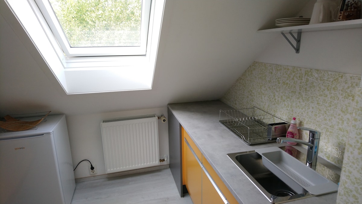 Мы предлагаем вам вам светлую квартиру на чердаке в нашем доме с тремя семьями: Она полностью отремонтирована и расширена до уютной однокомнатной квартиры. Квартира подходит для двух человек, с двуспальной кроватью и диваном-кроватью. Супермаркет, рынок и центр города находятся в 10 минутах. У нас автобусная остановка прямо за входной дверью. Автобус находится в 10-15 минутах от главного железнодорожного вокзала. Велосипеды запираются внутри гаража.