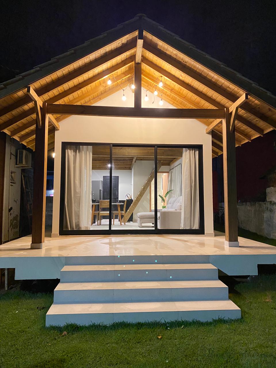 Большой дом 3 спальни. Первая спальня: 1 собственная ванная комната с низкой кроватью, шкафом, кондиционером. Вторая спальня с двуспальной кроватью, шкафом и кондиционером. 1 общественная ванная комната. Второй этаж: анзонин с диваном-кроватью и телевизором Smart TV. Третья спальня с двуспальной кроватью кроватью, шкафом и кондиционером. Гостиная и кухня. Придомовая территория с барбекю, гамаками, деревенскими диванами для отдыха. Ванная комната без душа. Сад, душ на открытом воздухе. Парковка