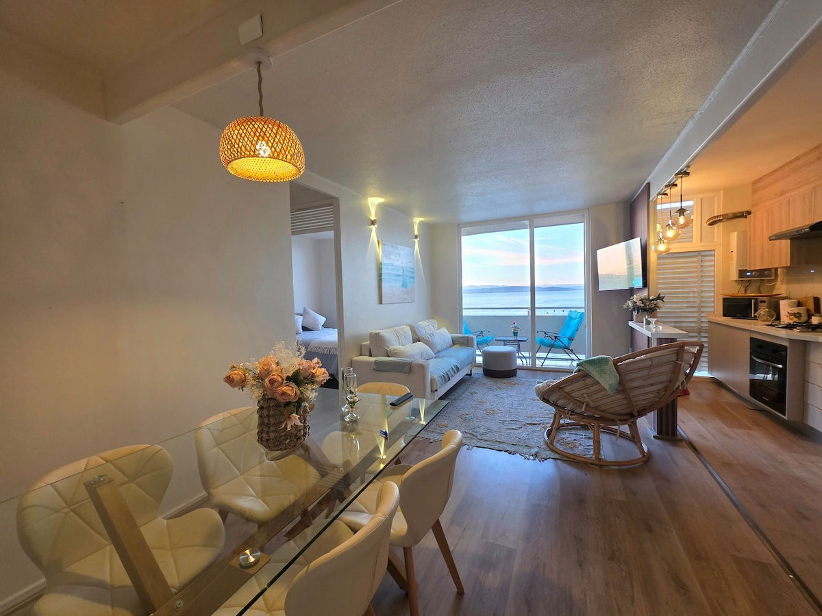 • Всего в 40 минутах езды от Консепсьона, с невероятным видом на море, нас встречает 120 кв. м на пляже. Роскошная квартира с просторной гостиной - столовой, 3 спальнями, 2 ванными комнатами, современной кухней с отдельной лоджией, просторной панорамной террасой со второй столовой, секционным диваном и элегантным стеклом SunFlex для круглогодичного отдыха. • Оборудовано для 6 человек, частный кондоминиум с круглосуточной охраной, кабельным телевидением, Wi-Fi, бассейнами, пляжем, морским клубом, квинчо, теннисными кортами и кортами.
