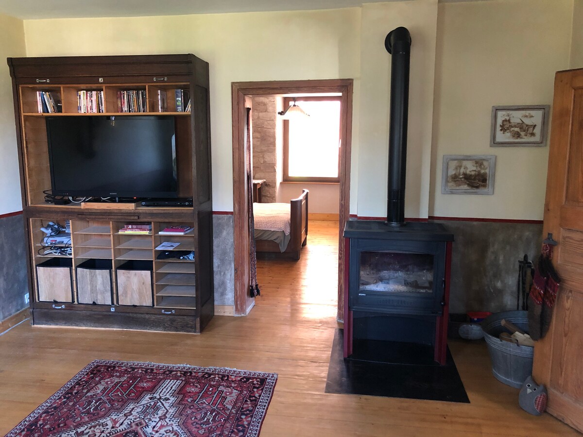 Полностью отремонтированная квартира, в маленьком доме. Встроенная кухня, ванная комната, двуспальная кровать в спальне и двуспальный диван-кровать, можно добавить раскладную кровать по запросу. Дом, расположенный на тихой улице небольшой деревни, где можно полюбоваться и посетить скалу Дабо, в середине большого лесного массива. Несколько пешеходных маршрутов поблизости.
