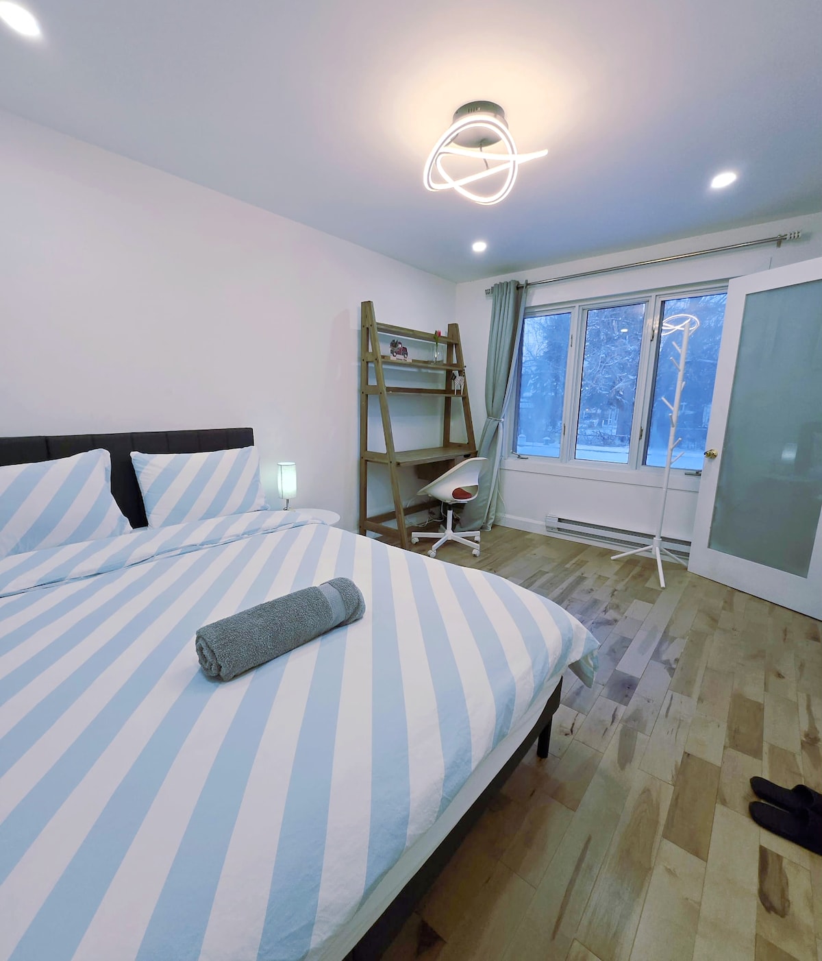 Лофт с балконом, собственной ванной комнатой, собственной мини-кухней, отдельным входом и парковкой в доме на одну семью недалеко от Монреаля. Жилье оборудовано настенным тепловым насосом, мобильной индукционной варочной панелью, небольшой духовкой из нержавеющей стали, полом с подогревом, детектором влажности, смарт-телевизором (Bell) и т. д. Это квин. Стиральная машина и сушилка общие. Ремонт завершен в январе 2023 года. Мебель изготовлена в 2023 году. Несколько магазинов в пешей доступности.