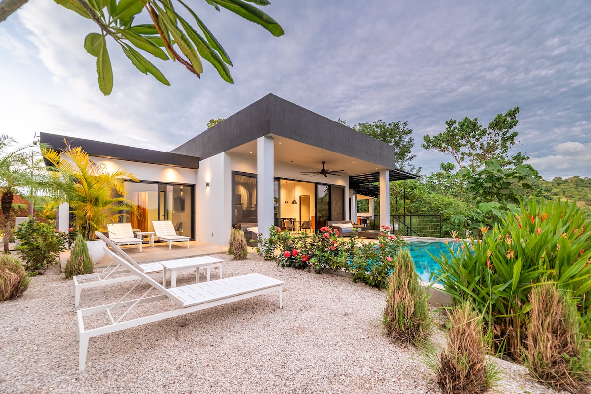 Thoughtfully designed, this elevated and high ceiling house offer all the comfort and convenience needed for both short and extended stays. - Loft bedroom with queen-size bed - Living room, sofa bed (medium) - Spacious and sunlit - Desk - Bathroom w/ rain shower - AC, ceiling fans - 100mb Wi-Fi - Safe box - Fully equipped kitchen (stove, fridge, microwave, coffee maker, more. - Covered terrace - Large sliding glass doors (w/ screens) - Laundry - Pool - Outdoor shower - Private & secure parking