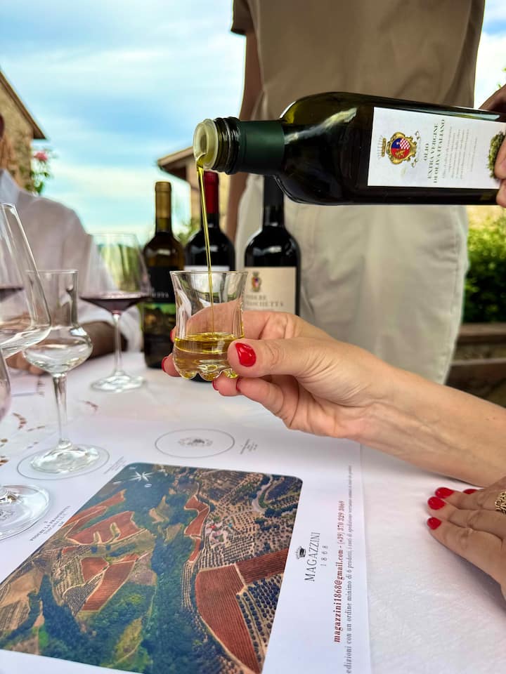 Дегустация оливкового масла холодного отжима среди оливковых деревьев Кьянти