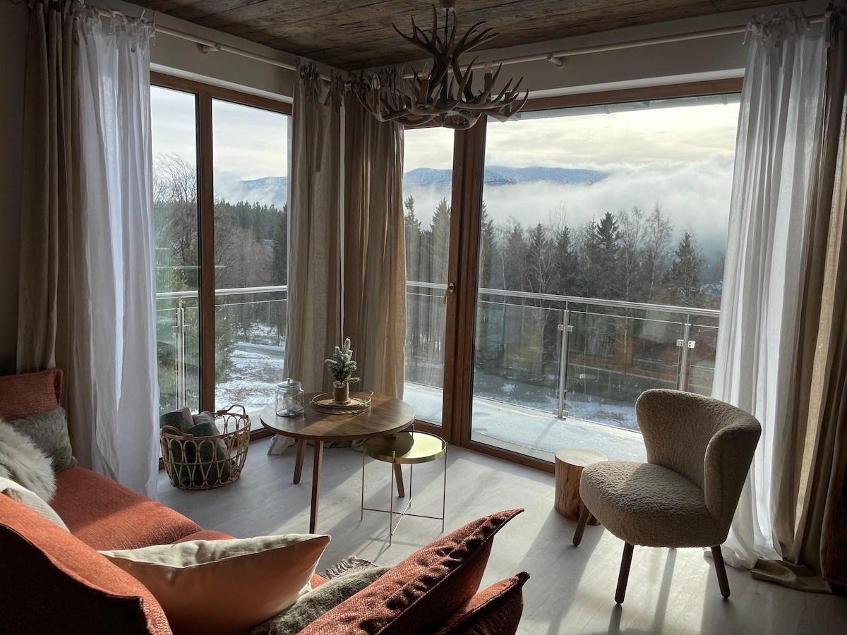 Skog — это современная квартира, оформленная в минималистском скандинавском стиле, в интерьере которой используются в основном натуральные материалы. Площадь около 70 кв. м, 2 отдельные спальни. Одна находится на чердаке с низким потолком. Просторная терраса принадлежит квартире. Она расположена в районе с другими домами, построенными в аналогичном стиле, в пешей доступности от центра. Водопад Мумлава находится всего в 10 минутах ходьбы по лесу. Здание 007 (тренажерный зал и сквош-центр) ремонтируется с 07/2025 по 03/2026.