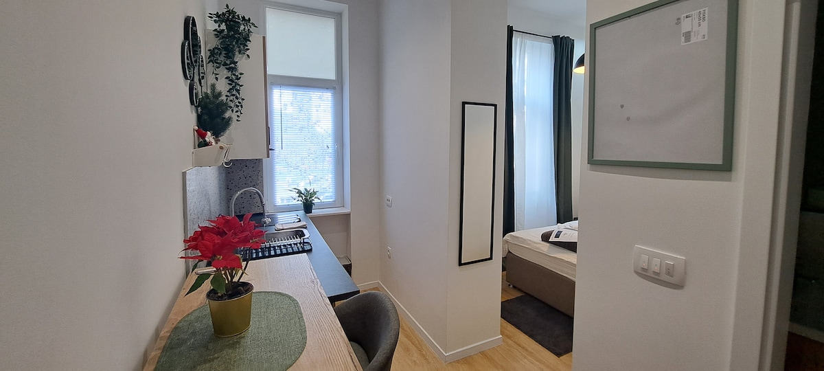 СОВЕРШЕННО новая элегантная квартира в ЦЕНТРЕ ГОРОДА менее чем в 10 минутах ходьбы от главной площади и железнодорожной станции. Жилье расположено на тихом заднем дворе на главной улице, так что вы можете наслаждаться тихими ночами. Есть одна спальня с двуспальной кроватью размера Queen size, гостиная с телевизором + NETFLIX и раскладным диваном (размера Queen size), ванная комната с туалетом и просторная душевая кабина. Вся мебель и бытовая техника совершенно новые. БЕСПЛАТНЫЙ чай и кофе,БЕСПЛАТНЫЕ полотенца.