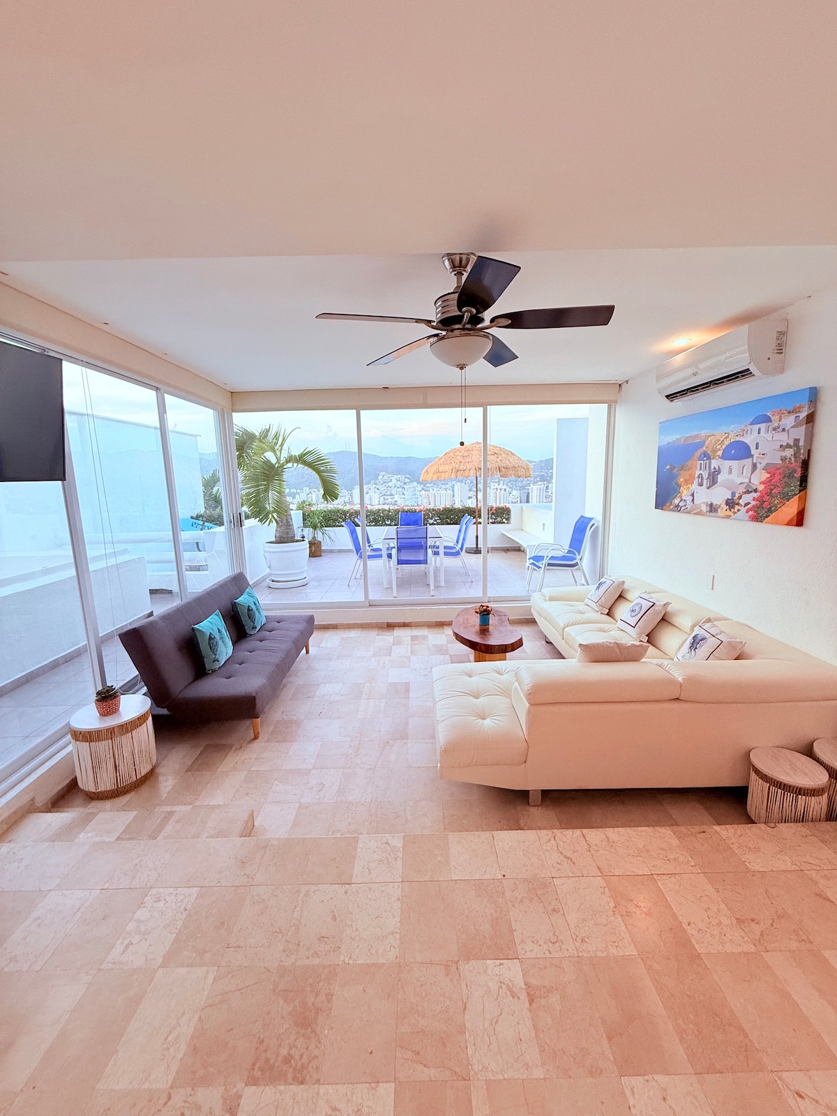Квартира оборудована 3 кондиционерами и 4 потолочными вентиляторами в столовой и спальнях. Wi-Fi, кухонная встроенная холодильная камера, кухонная утварь, микроволновая печь, телевизор, льдогенератор, чтобы взять на пляж и т. д. - Бассейн. 10 минут от пляжа Плайя-Порто-Маркес, 20 минут на машине от всех пляжей Зоны Диаманте. 20 минут до пляжей побережья по макротоннелю и 35 минут по живописной дороге. 5 минут от Plaza Patio Acapulco (Soriana, банки, кинотеатры, Starbucks, рестораны и т. д.).