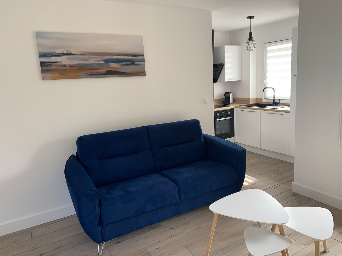 Dans une Rsd de 2 étages située à 100 m de la plage des Sables Blancs et de la thalasso de Tréboul, ce superbe T2 de standing de 32 m2 refait à neuf avec de très belles prestations vous accueillera au 1er étage sans ascenseur. Il est ouvert sur une terrasse de 5m2 et est tout équipé avec un lit king size 1.6mx 2m, lave linge, lave vaisselle, frigo congélateur, Nespresso, four multifonctions, TV 117cm, grille pain... Canapé-lit du salon 140x190. Belles vacances. Kristell 😀