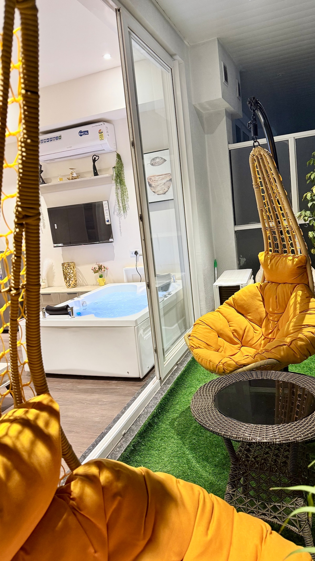 Добро пожаловать в роскошную частную студию на 11-м этаже в Satya The Hive, сектор 102, Гургаон. В этой красиво оформленной отдельной комнате есть тихий внутренний дворик с горшками и качелями, собственное джакузи, идеально подходящее для пар и предлагающее идеальную обстановку для отдыха, и отдельный вход для полной уединенности. В распоряжении гостей полностью оборудованная мини-кухня, роскошная ванная комната с современной сантехникой, красивым зеркалом и необходимыми туалетными принадлежностями. Идеально подходит для романтического отдыха или спокойного пребывания в городе.