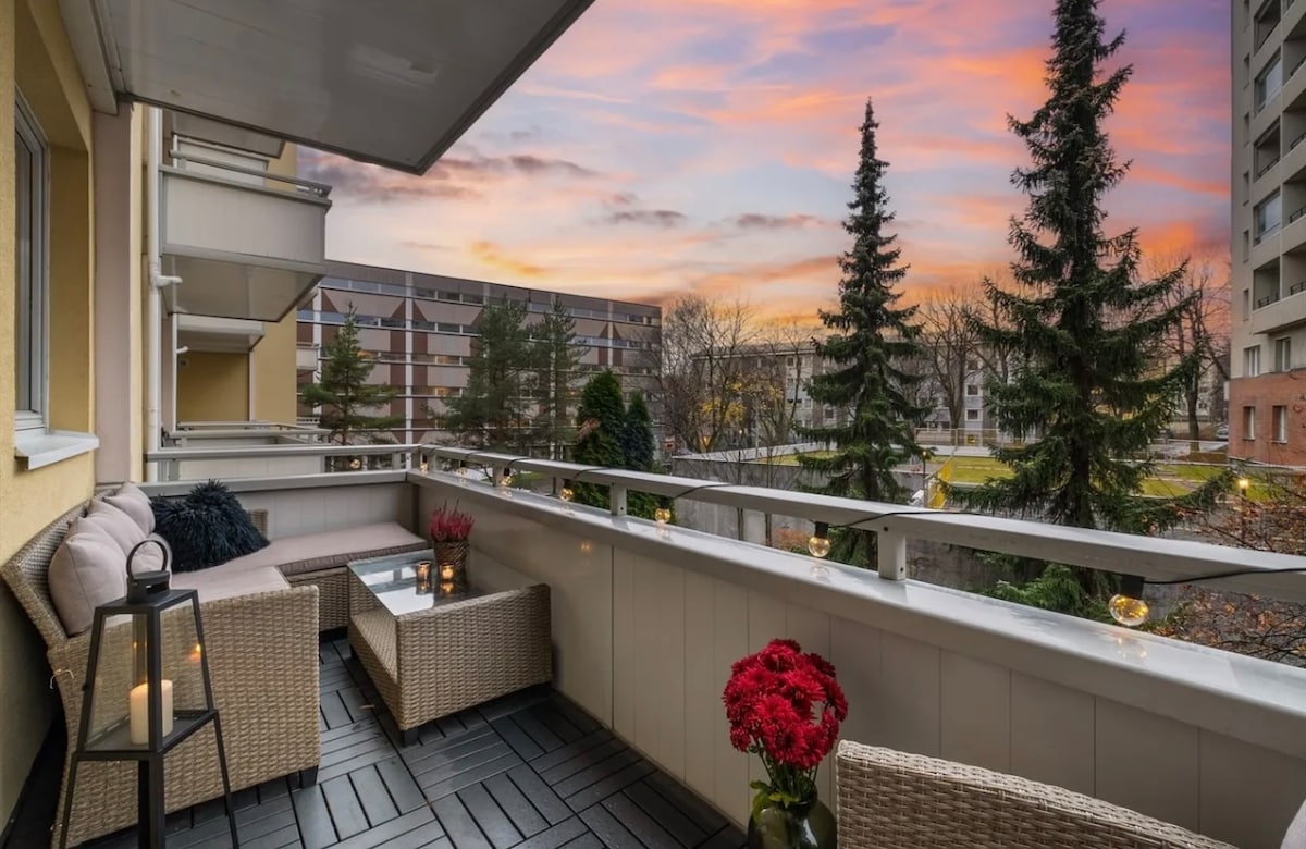 Солнечная квартира на балконе с автобусом прямо на улице.