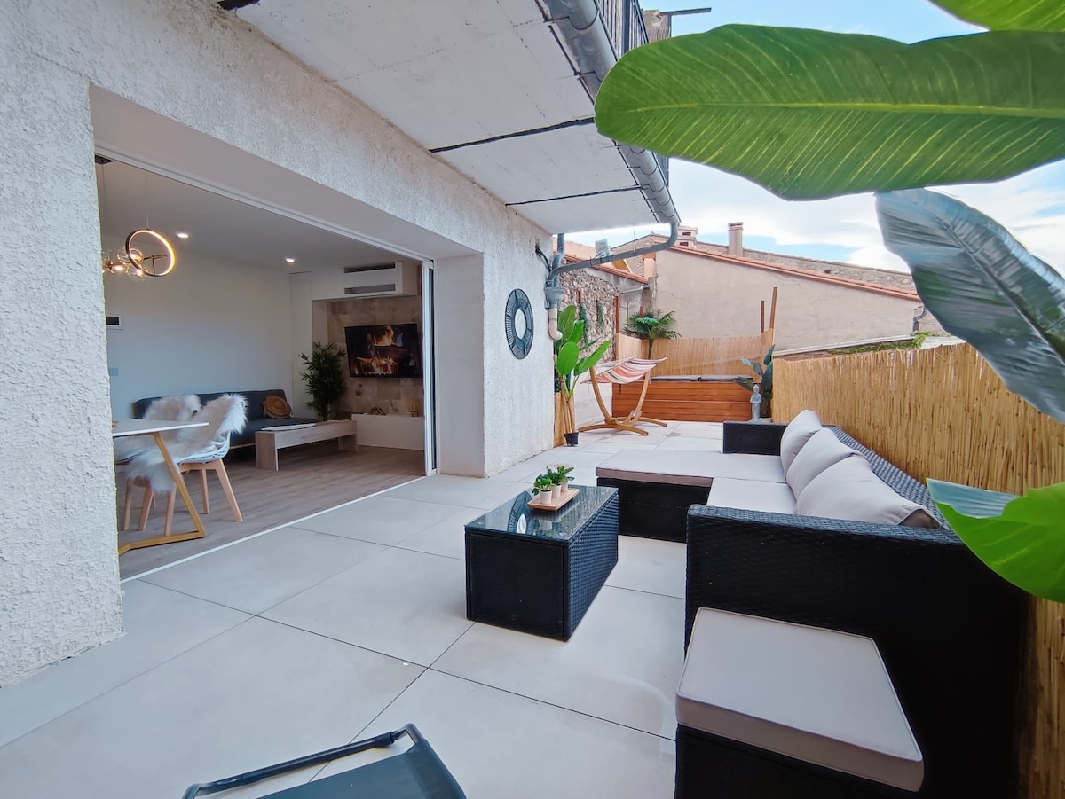 В тихом жилом районе,недалеко от Кольюра , двухсторонний дом с садом ,кондиционером, крытой террасой, 6-местным спа-салоном, солнечным душем, зоной планча, видом на Альбер, в 10 минутах от моря , душевой кабиной, гостиной, столовой, LED-телевизором, полностью оборудованной кухней (посудомоечная машина, индукционная варочная панель, посуда, микроволновая печь, духовка, 2 кофеварки), электрический гараж, прачечная с морозильной камерой, холодильник с морозильной камерой и стиральной машиной 7 кг.