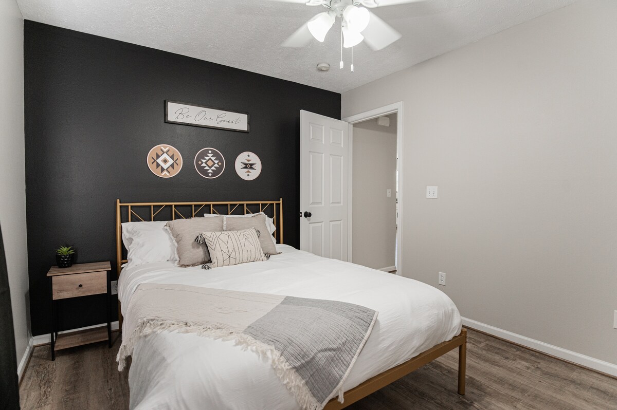 Недавно отремонтированный дом, расположенный в тихом районе недалеко от всего города и удобно расположен недалеко от межштатной автомагистрали. В доме есть гараж на 2 машины и экранированное заднее крыльцо. 3 спальни, включая кровать размера King size и 2 кровати размера Queen size. В спальнях есть затемняющие жалюзи, а во всех окнах есть пленка для уединения. 2 ванные комнаты, одна из которых является главной спальней с собственной ванной комнатой. Обеденный стол на 6 человек и полная прачечная. Сенсорные лампы/USB-порты на тумбочках. Зона для курения снаружи на крыльце.