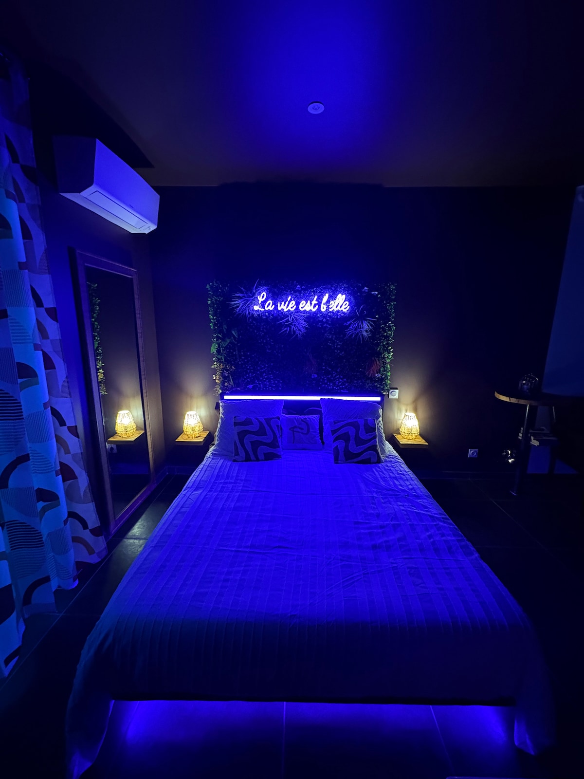 🧘💆🛌Passez un moment de détente dans une chambre avec accès totalement indépendant, à la décoration apaisante et sa salle de cinéma toute équipé attenante. 🌞Pour la période d'été : - vous pourrez profiter de la terrasse extérieure et un accès à une piscine creusé et chauffé. la salle de cinéma peu être transformé en chambre pour accueillir deux personnes supplémentaires - Petit déjeuner compris : croissants, pains au chocolat, pain au raisins, baguette au choix, jus de fruits etc...