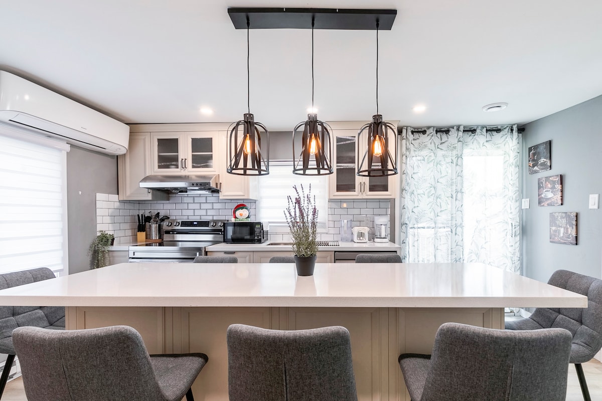 Приезжайте всей семьей в это тихое место, где много места для развлечений. Современная большая квартира с 2 спальнями на 2 этаже в тихом здании рядом с ресторанами, магазинами и парками. Бесплатная парковка и зарядка электромобиля прямо через дорогу. Большой телевизор, Netflix, полностью оборудованная кухня, кровать размера King size в главной спальне кроватью размера King size и двуспальная кровать размера Queen size во 2-й спальне. Высокоскоростной кабельный Wi-Fi. 10–15 минут до центра Монреаля, рядом с основными достопримечательностями. Максимум 4 гостя, включая детей. Курить и привозить домашних животных запрещено. CITQ #313074