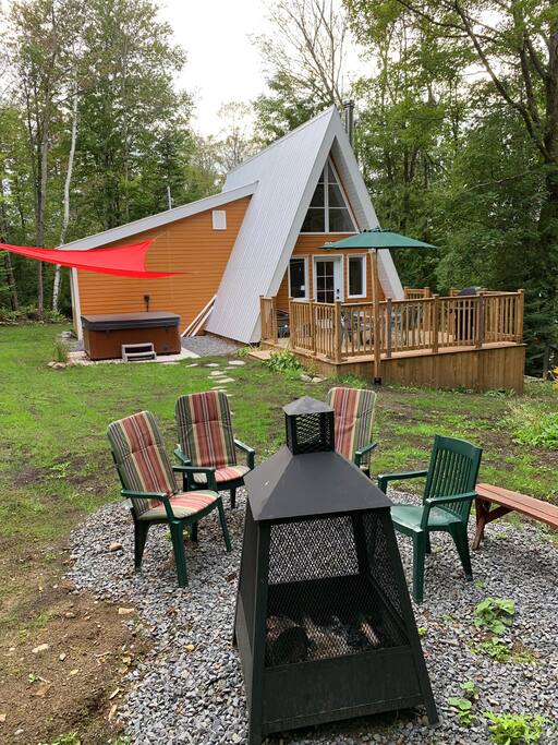 Our Nordic forest chalet is perfect for spending quality time as a couple (or with a kid), or for a work-retreat (with high-speed WiFi). The wooden interior is warm and cozy. The full-height windows offer stunning views over a forested valley. The open-concept kitchen and living room keep you in the conversation while cooking. If you prefer to cook outside, there is a fire pit with a grill and outdoor dining table. Only 70-min drive from Montreal. The lake is a 25-min walk if you park nearby.