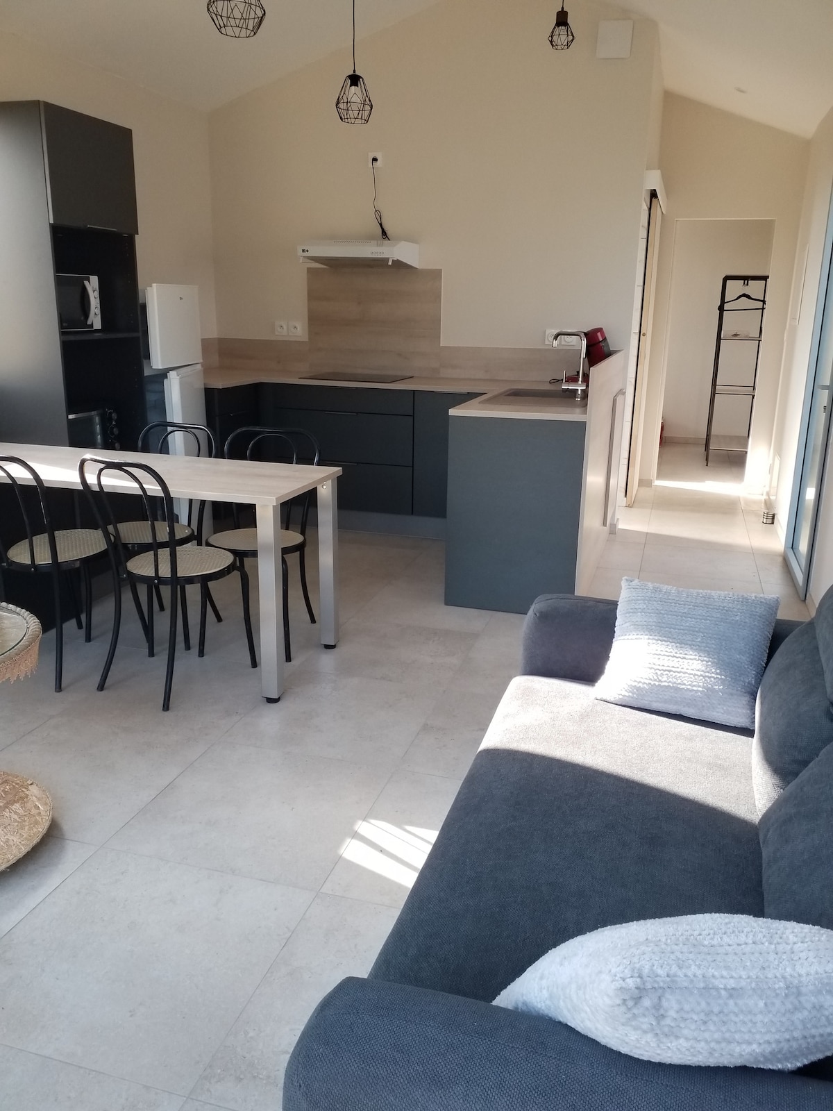 Appartement moderne et lumineux, climatisé, parfait pour un séjour confortable seul ou à deux. La cuisine est entièrement équipée (four, plaque de cuisson, réfrigérateur, lave-linge) et ouverte sur un salon cosy avec canapé et espace repas. Décoration élégante et épurée avec touches végétales et bois. Chambre calme, salle de bain avec douche. Situé à proximité des commodités, cet appartement offre tout le confort nécessaire pour un séjour relaxant.