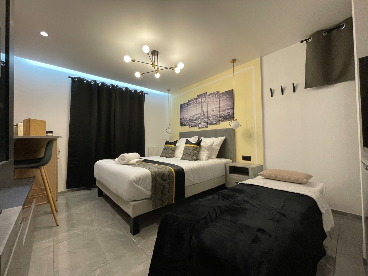 ❤️🔥 Откройте для себя роскошный БАРХАТ и КОЖА Love Room в 20 минутах езды от Парижа, идеально подходящий для романтического и сексуального отдыха ! 💎 Гидромассажная ванна, собственная сауна, двуспальная кровать размера King size с эффектом облака, стрип-бар, диван для тантры и т. д. 💋 Откройте для себя новые ощущения и создайте незабываемые воспоминания в невероятно оборудованной игровой комнате BDSM 🎬 92-дюймовый кинотеатр с видом на кровать с Netflix, Prime Vidéo, Disney+, Spotify. 💫 Отдохните в оазисе спокойствия и роскоши и получите незабываемые впечатления !