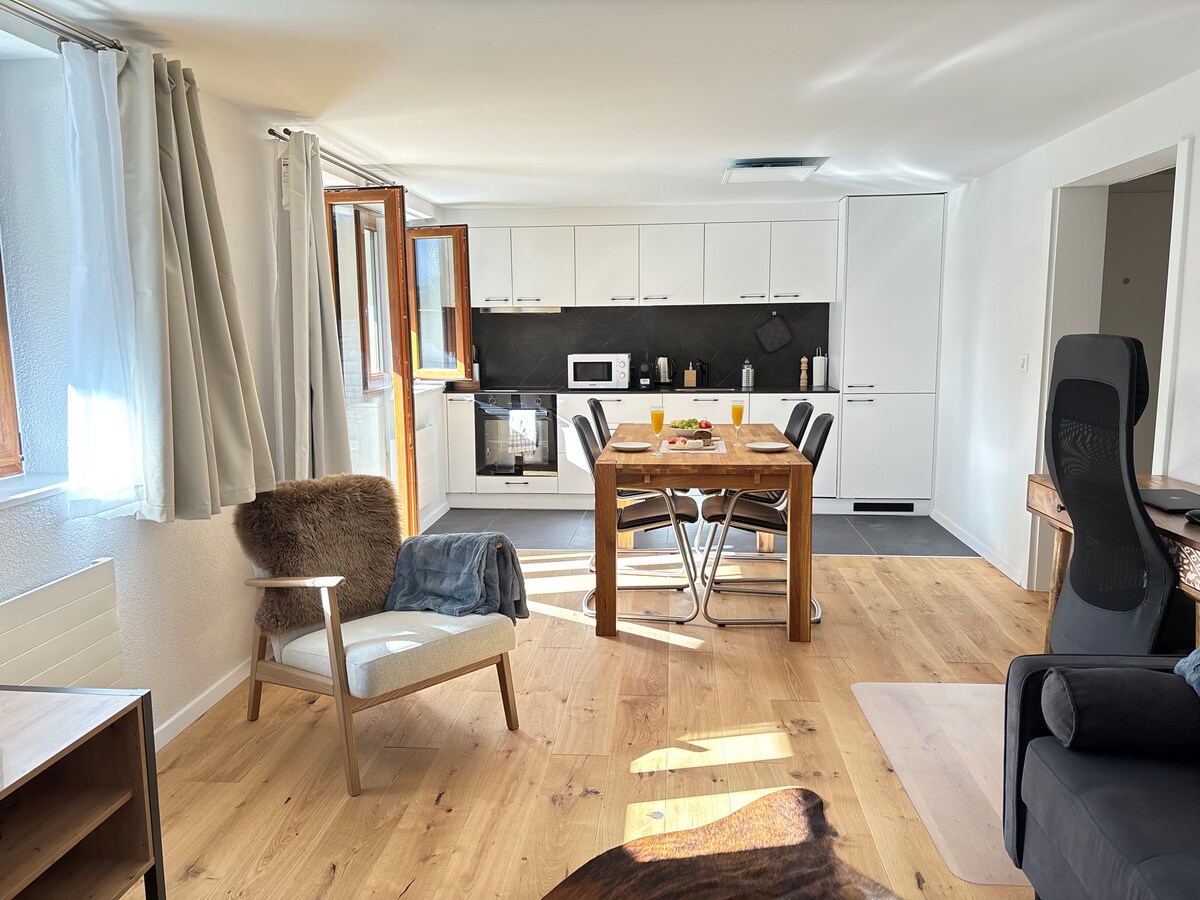 Наслаждайтесь проживанием в этой стильной квартире в центре города — всего в 200 метрах от подъемника и в нескольких минутах от магазинов, кафе и пешеходных маршрутов. Отдохните на собственной террасе, расслабьтесь в уютной гостиной и насладитесь всеми современными удобствами — быстрым Wi-Fi, телевизором со Smart TV и полностью оборудованной кухней. Редкий бонус в этом районе: частная парковка включена (обычно 8 швейцарских франков в день). Идеально подходит для пар, друзей или одиночных путешественников, ищущих современный альпийский отдых с идеальным сочетанием комфорта, стиля и местоположения.