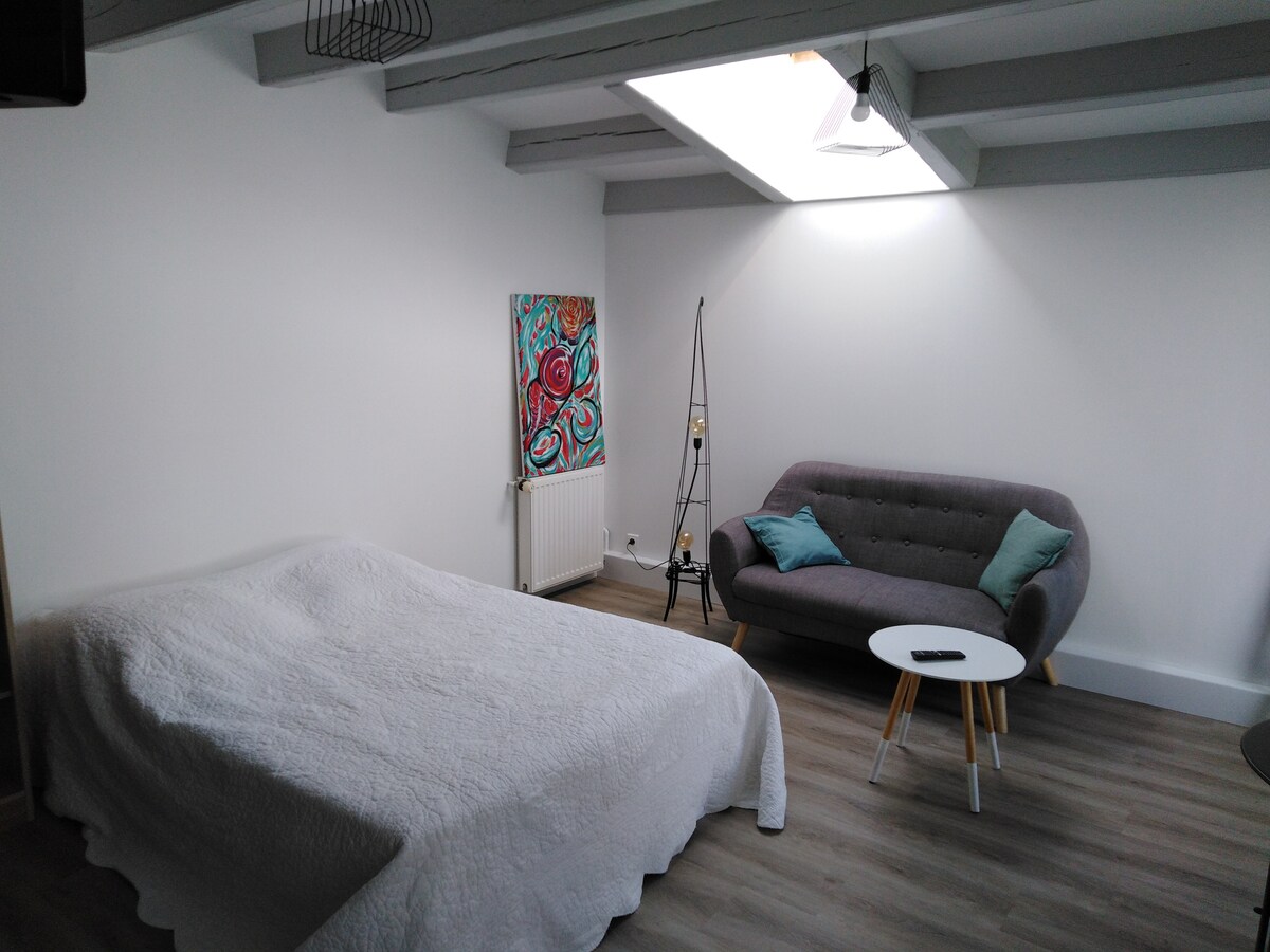 Новая студия в тихом районе недалеко от Ла-Рошели. Идеально расположен вокруг нескольких достопримечательностей, до которых можно добраться на машине: 15 минут до моста Иль-де-Ре. 10 км от старого порта. 20 минут до приморского курорта Chatelaillon Plage. и недалеко от болота Пуитвина, Фураса и острова Олерон... оборудована кофеваркой, тостером, микроволновой печью Есть постельное белье и полотенца.