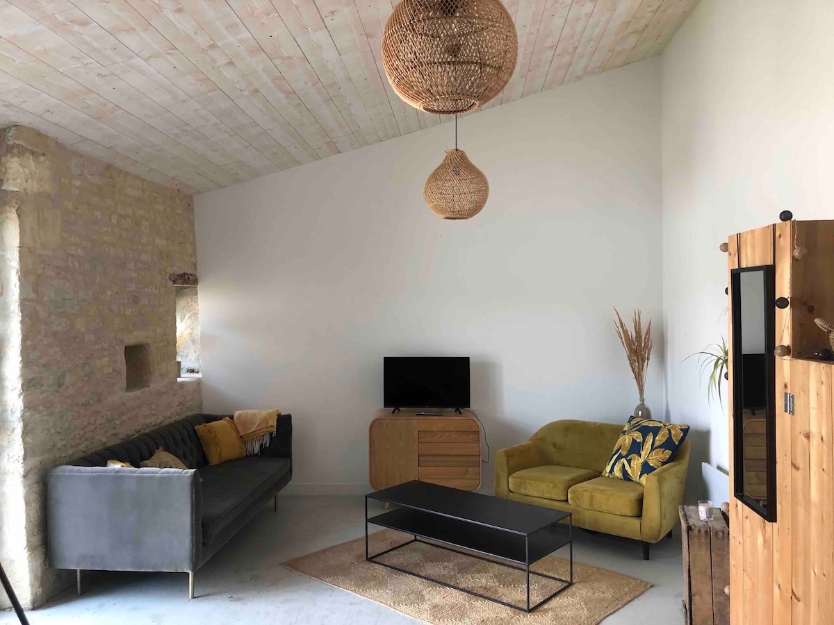 Насладитесь комфортом этого нового жилья с кондиционером, состоящим из: - наверху с 2 спальнями, каждая с душевой комнатой и туалетом; — На первом этаже гостиная/кухня, небольшая частная терраса и парковочное место. Предоставляем постельное белье и полотенца. Доступны кофемашина Nespresso, духовка, микроволновая печь, чайник, посудомоечная машина, стиральная машина, Wi-Fi и звуковой телевизор. Расположен в 10 минутах от въезда в Ла-Рошель, в 20 минутах от моста на остров Ре и в 30 минутах от болота Пуату.