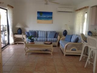 Cozy beachfront apt at Dieppe Bay Villas, Falmouth Harbour. King bed sleeps 2-3 with AC in bedroom, living room & kitchen. Comfy sleeper sofa sleeps 2. Full kitchen: espresso & coffee makers. Smart TV, fast Wi-Fi, washer/dryer, huge ocean-view balcony, ample closets. Private beach access with snorkel gear, paddleboard; bikes on request (small fee). Partnered with Dojo On The Wave Charters for savings on nearby sailing/powerboat trips. Updated & perfect for small Families couples/small groups!